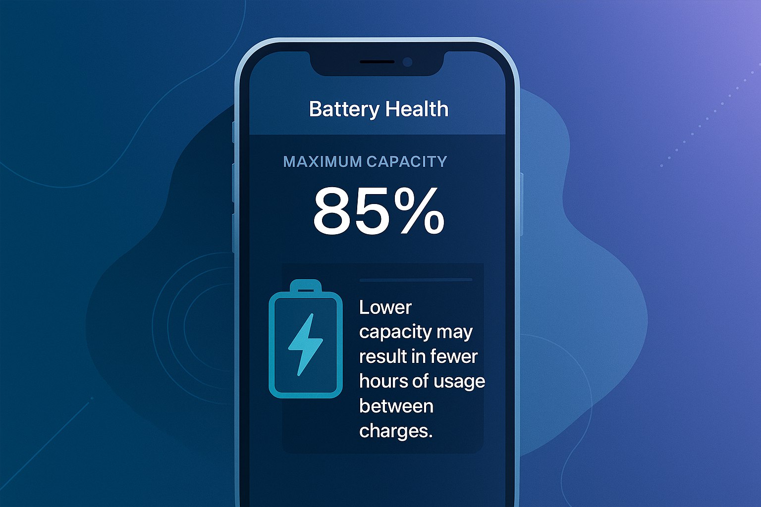 バッテリー劣化度とは、購入当初のバッテリー容量(100%)に対して、現在どれくらいの容量を維持できているかを示す数値です。たとえば「最大容量 85%」と表示されている場合、新品時と比べて85%の性能を保っていることを意味します。この数値が低くなるほど、バッテリーの持ちが悪くなっていきます。